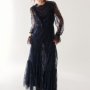 Le silhouette scorrono fluide tra abiti lunghi e tailleur classici, alternando linee essenziali a volumi morbidi e ariosi. Trasparenze leggere, dettagli in pizzo e lavorazioni delicate si uniscono a tessuti impalpabili, mentre scolli profondi e maniche ampie donano movimento e grazia.