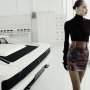 La campagna FW25, scattata da Robin Galiegue nell’e-building di Maranello, trasforma questo spazio in un laboratorio avveniristico. Il bianco lustro delle pareti e la luce chiara sottolineano l’eleganza operosa di chi indossa abiti che uniscono matericità sensuale e precisione ingegneristica.