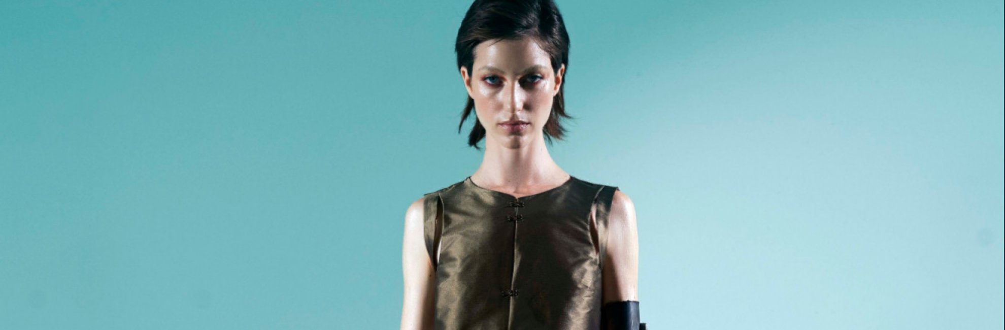Quel che era il Lago Della Mezzaluna, luogo del magico incontro con Utnapishtim, saggio immortale sopravvissuto al diluvio universale, lago in cui l’eroe s’immerge per agguantare la pianta che riporta vigore al corpo e alla vita, dona la forma di mezzaluna alla stoffa per farne intarsi sulle trasparenze del reggiseno, o tondi scavi di nudo sotto al petto del corsetto. Quel che era l’apparizione sagace del Serpente, che all’eroe sottrae la pianta miracolosa godendone i benefici di ringiovanimento fino a mutare il manto, s’indovina nel manicotto in cui il tessuto arrotolato lo ritrae, poi scompare nell’assottigliarsi in lacci sinuosi che s"avvinghiano sulla pelle svelata e s "avviluppano in spire armoniose a chiudere i lembi del capo in doppia vestibilità, infine riappare nella sorprendente sperimentazione dove il calore scalda e ripiega tasselli di poliestere riciclato che sulla camicia si assemblano tutti in una goffratura, lavorazione d’illusione stupefacente a rievocare le squame da serpente della pelle perduta.