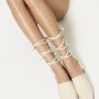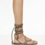 Protagonisti della collezione sono il sabot flat in morbida nappa color burro e il sandalo flat in nappa color safari, uniti da un dettaglio iconico: lacci tubolari cuciti a mano e definiti da nodi, da indossare con libertà sotto il ginocchio o alla caviglia. Un elemento decorativo e funzionale che dona carattere al passo e personalità al look.