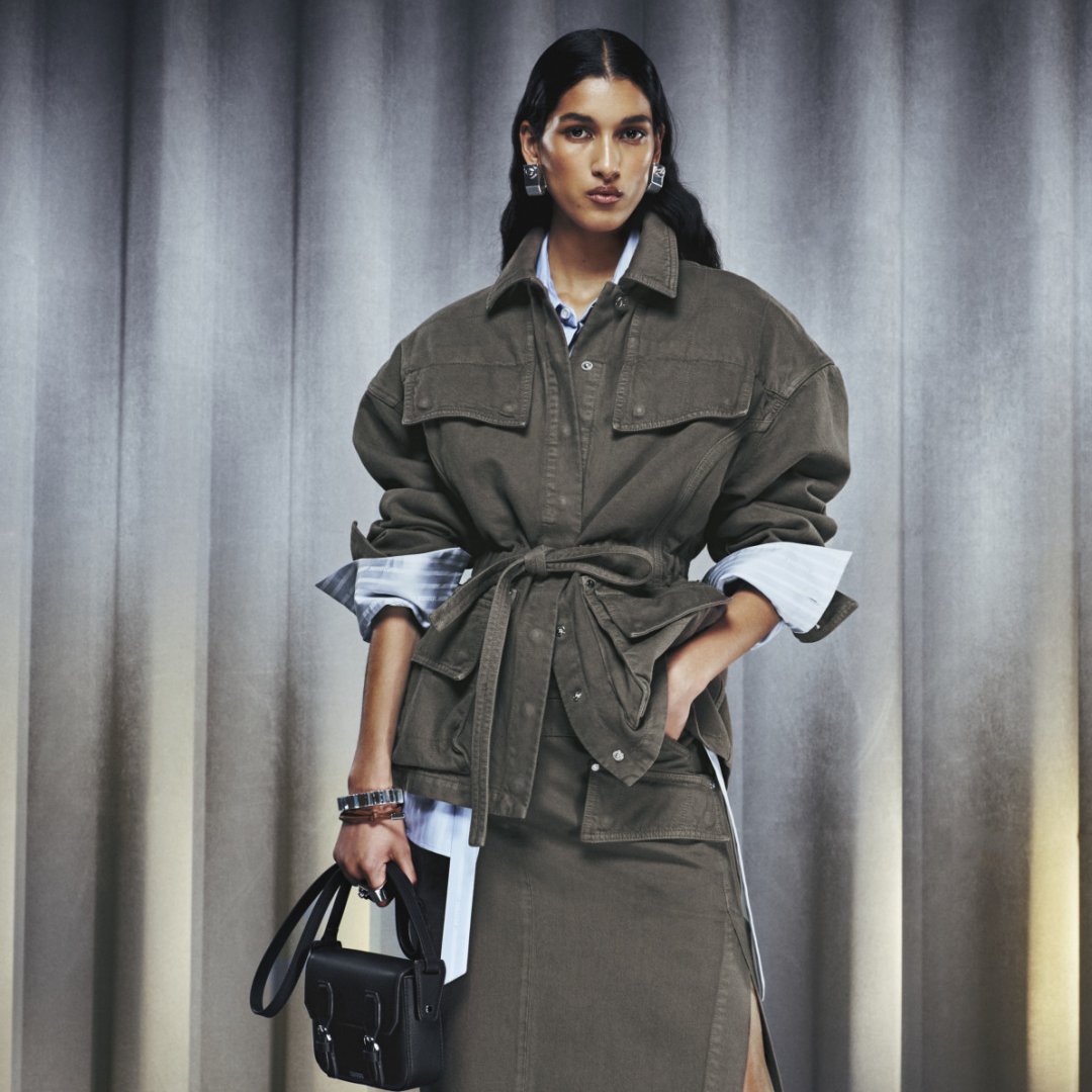 Il logo, incastonato in una staffa centrale in metallo, dialoga con gli anelli dei manici e richiama con eleganza l’universo equestre, reinterpretato in chiave urbana.