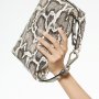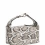 La borsa bAGL è un accessorio multifunzionale: può essere portata a mano grazie al manico con gancio in metallo o indossata a tracolla con la tracolla staccabile. Realizzata in pelle stampata pitone bianca e nera, si distingue per l’attenzione ai dettagli e le finiture artigianali, che la rendono versatile e immediatamente riconoscibile.