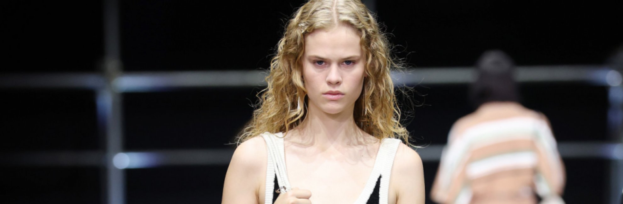 In passerella, uno stagno riflettente amplifica il dialogo tra luce e struttura, mentre i colori vibranti — dal blu al glicine, fino all’arancio simbolico — raccontano un’energia positiva e rigenerativa. Una collezione che celebra la resilienza silenziosa, trasformando l’effimero in qualcosa di duraturo e straordinariamente contemporaneo.