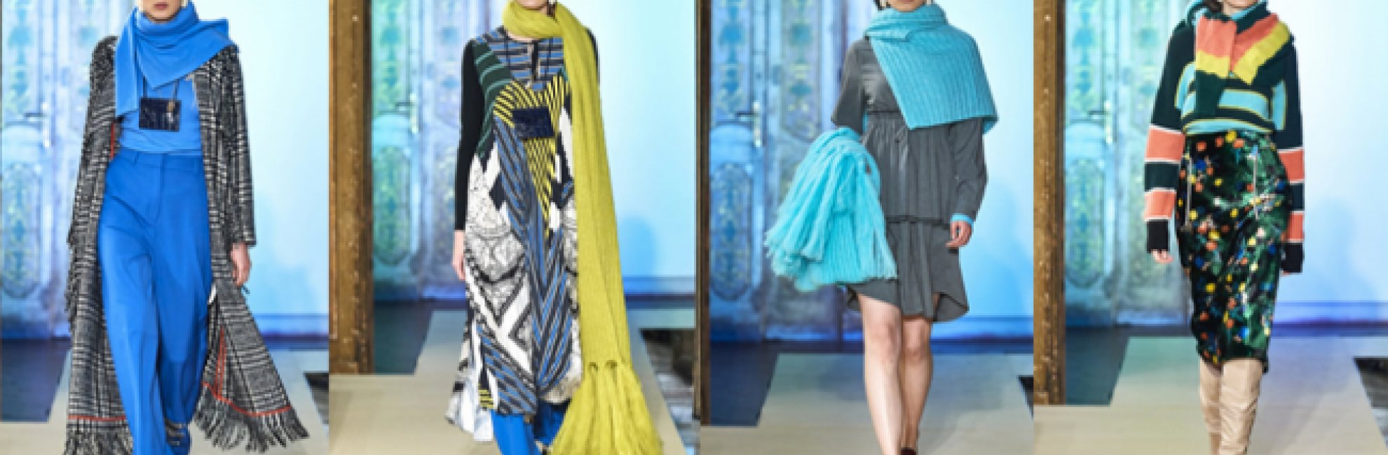 Il concetto di vintage rinnovato si esprime con grafie floreali che vengono proposte nella seta fluida color melanzana e nel velluto verde scuro. L’estetica geometrica viene inserita nuovamente e plissettata crea gonne asimmetriche con mix di diversi plissé hand-made e abiti fluidi a tunica. La maglieria in merinos si mescola alla stampa plissettata e si alterna a pull in costa inglese in mohair acquamarina e a giochi di righe sfalsate a più colori. La flanella gessata riporta al mondo maschile, a cui viene dato un twist grazie a nuove nuance come il grigio insieme al fucsia e al verde acqua. Il grigio viene poi sviluppato come focus di un intero corner che mescola colori e capi minimal ad una declinazione inedita della maglieria, che ravviva il corner con colori neon super vitaminici.